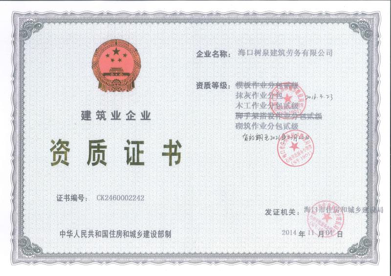 ??跇淙ㄖ趧沼邢薰境闪⒂?011年,公司位于???,其前身是一家專業建筑施工隊,自2004年即開始在海南從事建筑勞務施工。自成立至今,公司已經擁有一支科學管理、質量過硬、能打硬仗,搶工期的專業隊伍。能獨立承擔大中型工業與民用建筑 、室內外裝修、各類機電設備安裝工程。代表工程有海口濱海華庭、三亞時代海岸T01/02/04/05棟高層、合肥東?;▓@二期、陵水富力灣B區高層、三亞金中海(酒店)、瓊海大印經典花園、海口環球海景大酒店(四星級酒店,在建中)、陵水珍珠大廈(五星酒店)、??谌f達廣場、美蘭機場二期。